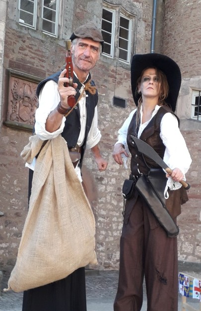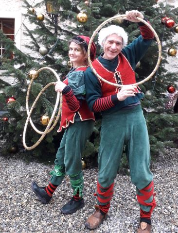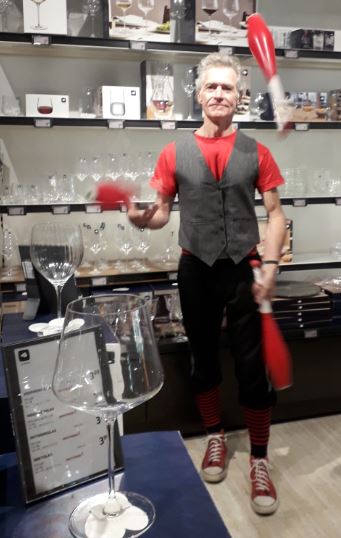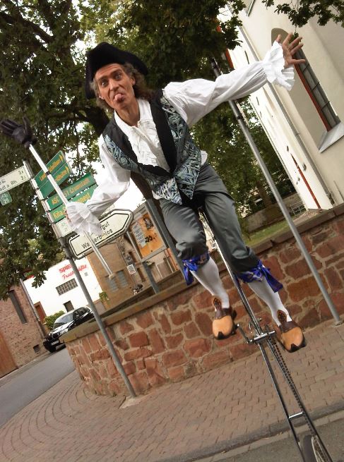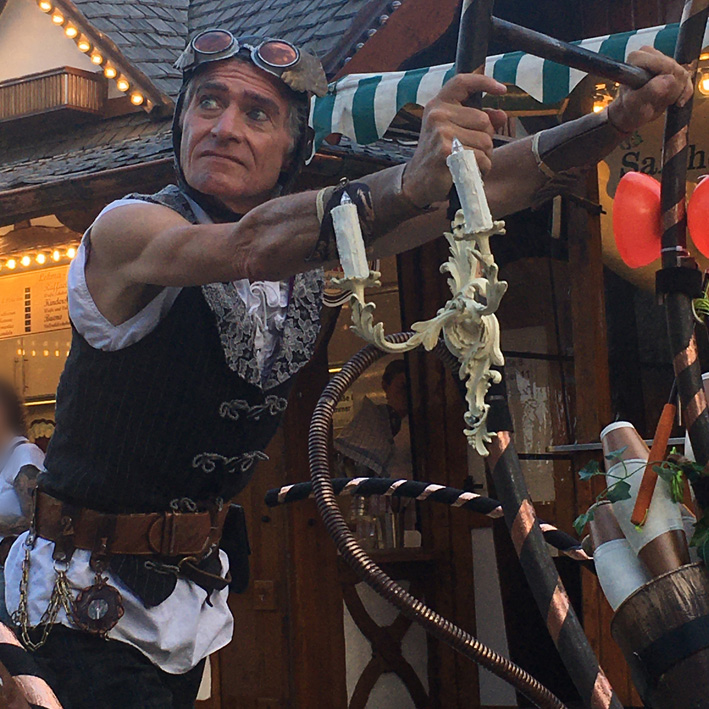 Der Gaukler zieht übers Gelände und macht einzelne Kunststücke oder 1-3min Mini-Shows mit Keulen, Diabolo oder Einrad. Im Duo auch mit Akrobatik oder mit Akkordeon-Begleitung. Die Requisiten werden von Runde zu Runde gewechselt.