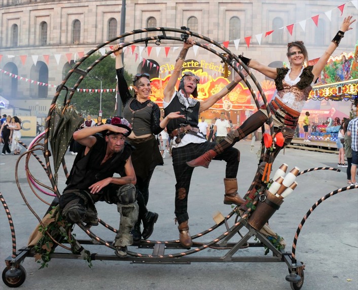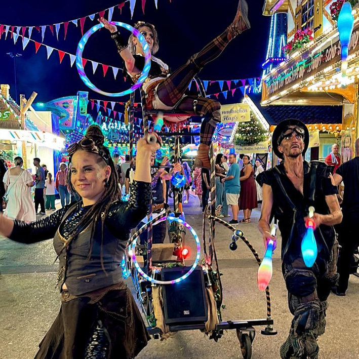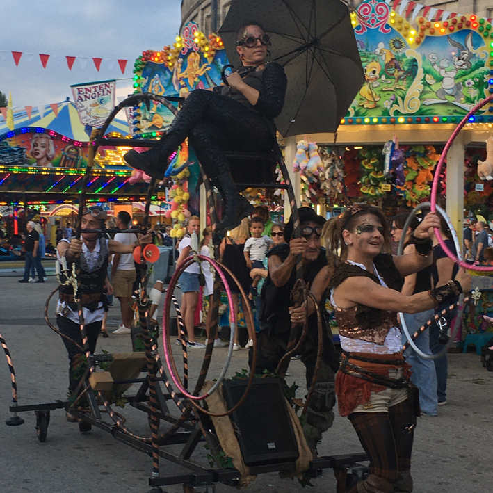 Unser SUV ist ein Steampunk-Unterhaltungs-Vehikel ohne CO2-Emission. Das altmodisch-futuristisches Vehikel wird von vier Artisten durch die Menge bugsiert, dabei wird geturnt und jongliert und Spaß verbreitet. An Haltestellen gibt es eine kurze Shows mit Jonglage, Hula-Hoop, Diabolo und Artistik. Bei Dunkelheit beleuchtet und mit Leuchtrequisiten. Bei Bedarf haben wir auch eine Musikanlage an Bord.